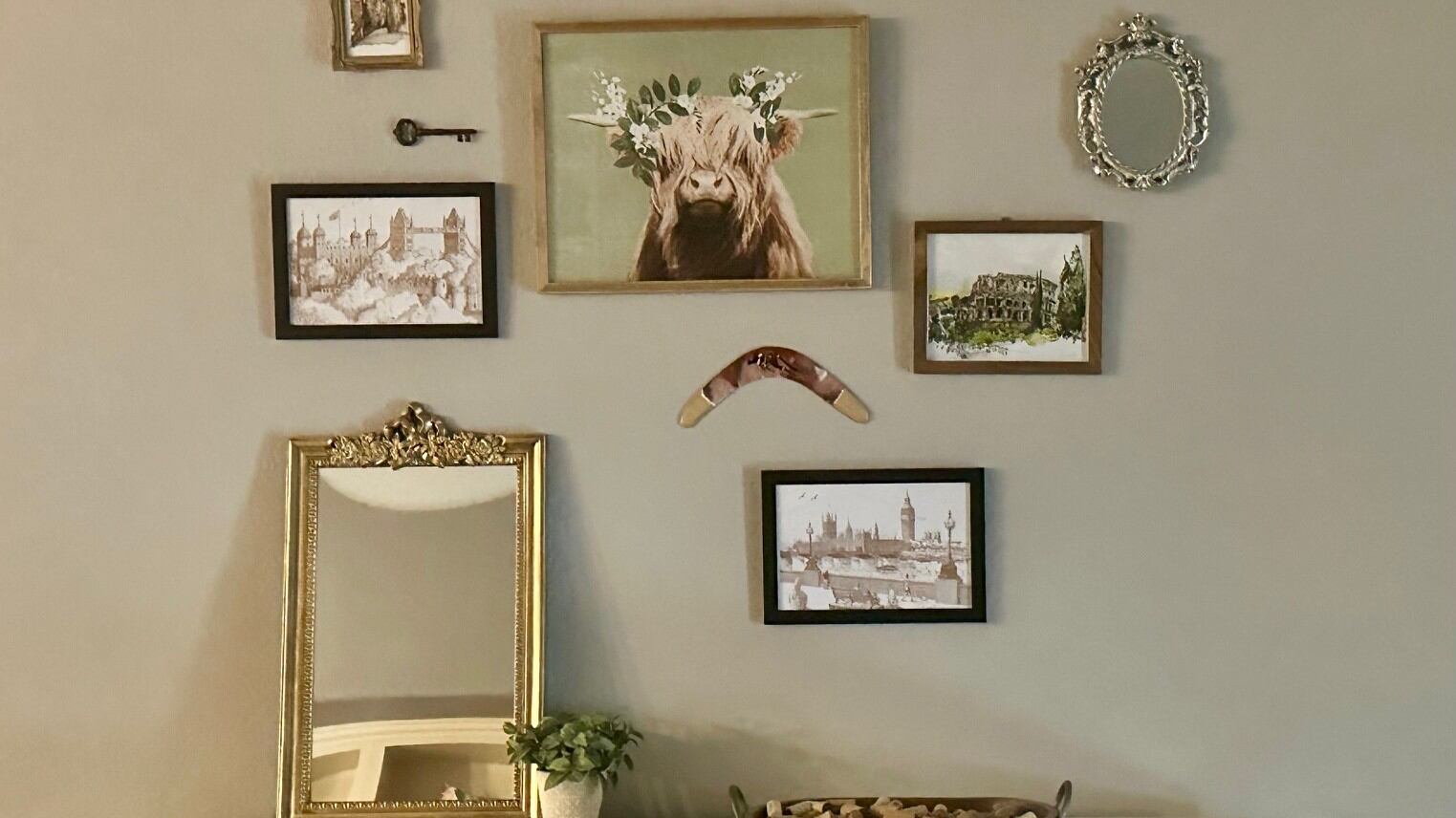 Check out my collage wall! It’s made up of art and trinkets from our travels. I love this new decor trend of random items coming together in an unbalanced way.