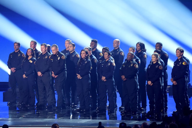 67th GRAMMY Awards - Show LOS ANGELES, CALIFORNIA - FEBRUARY 02: (FOR EDITORIAL USE ONLY) Los Angeles County Fire Department Chief Anthony C. Marrone (C) and members of the Los Angeles County Fire Department speak onstage during the 67th GRAMMY Awards at Crypto.com Arena on February 02, 2025 in Los Angeles, California. (Photo by Amy Sussman/Getty Images) (Amy Sussman/Getty Images)