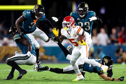 Kansas City Chiefs v Jacksonville Jaguars JACKSONVILLE, FLORIDA - OCTOBER 06: Marquise Brown #5 of the Kansas City Chiefs carries the ball as he attempts to evade Andrew Wingard #42, Foye Oluokun #23, Tyson Campbell #3, and Devin Lloyd #0 of the Jacksonville Jaguars during the second quarter at EverBank Stadium on October 06, 2025 in Jacksonville, Florida. (Photo by Megan Briggs/Getty Images) (Megan Briggs/Getty Images)