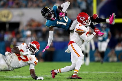 Kansas City Chiefs v Jacksonville Jaguars JACKSONVILLE, FLORIDA - OCTOBER 06: Travis Hunter #12 of the Jacksonville Jaguars catches the ball against Bryan Cook #6 and Chamarri Conner #27 of the Kansas City Chiefs during the third quarter at EverBank Stadium on October 06, 2025 in Jacksonville, Florida. (Photo by Mike Carlson/Getty Images) (Mike Carlson/Getty Images)