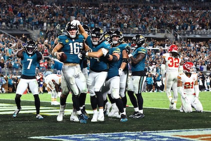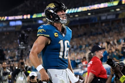 Kansas City Chiefs v Jacksonville Jaguars JACKSONVILLE, FLORIDA - OCTOBER 06: Trevor Lawrence #16 of the Jacksonville Jaguars celebrates a touchdown against the Kansas City Chiefs during the fourth quarter at EverBank Stadium on October 06, 2025 in Jacksonville, Florida. (Photo by Megan Briggs/Getty Images) (Megan Briggs/Getty Images)
