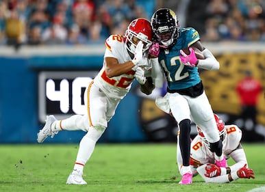 Kansas City Chiefs v Jacksonville Jaguars JACKSONVILLE, FLORIDA - OCTOBER 06: Travis Hunter #12 of the Jacksonville Jaguars runs the ball after a catch against Bryan Cook #6 and Trent McDuffie #22 of the Kansas City Chiefs during the second quarter at EverBank Stadium on October 06, 2025 in Jacksonville, Florida. (Photo by Mike Carlson/Getty Images) (Mike Carlson/Getty Images)