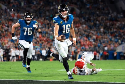 Kansas City Chiefs v Jacksonville Jaguars JACKSONVILLE, FLORIDA - OCTOBER 06: Trevor Lawrence #16 of the Jacksonville Jaguars scores a touchdown against the Kansas City Chiefs during the fourth quarter at EverBank Stadium on October 06, 2025 in Jacksonville, Florida. (Photo by Megan Briggs/Getty Images) (Megan Briggs/Getty Images)