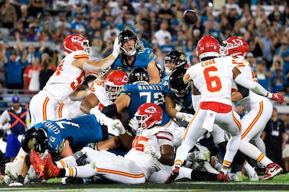 Kansas City Chiefs v Jacksonville Jaguars JACKSONVILLE, FLORIDA - OCTOBER 06: Trevor Lawrence #16 of the Jacksonville Jaguars fumbles the ball near the goal line against the Kansas City Chiefs during the second quarter at EverBank Stadium on October 06, 2025 in Jacksonville, Florida. (Photo by Mike Carlson/Getty Images) (Mike Carlson/Getty Images)