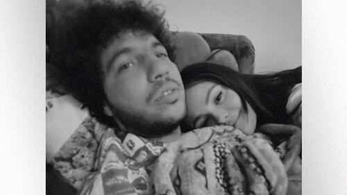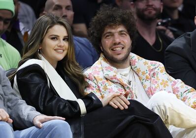 Lakers vs Heat at Crypto.com Arena Los Angeles, CA - January 03: Actress Selena Gomez, left, and actor Benny Blanco during the first half of an NBA basketball game between the Los Angeles Lakers at Crypto.com Arena in Los Angeles Wednesday, Jan. 3, 2024. (Allen J. Schaben / Los Angeles Times via Getty Images) (Allen J. Schaben/Los Angeles Times via Getty Imag)