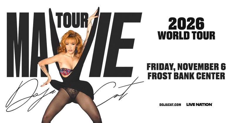 NO PURCHASE NECESSARY. VOID WHERE PROHIBITED. 10/06/25-10/10/25. Open to legal TX residents residing in one of the following counties: Atascosa, Bexar, Bandera, Comal, Guadalupe, Kendall, Medina, Wilson, and Zavala counties, 18+. To enter listen for the cue to call and follow the on-air instructions. Ten (10) winners will be selected according to the on-air announcement. Odds vary. Prize: Two (2) tickets to Doja Cat, November 6, 2026 at the Frost Bank Center. (ARV: $120.00) For full rules, click here. Sponsor: Cox Radio, LLC, d/b/a Cox Media Group San Antonio, 8122 Datapoint Dr. #600, San Antonio, TX 78229.