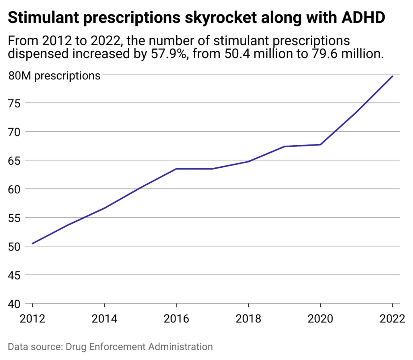 Between 2012 and 2022, stimulants dispensed in the U.S. increased by 57.9%, according to a report commissioned by the DEA. Three times more stimulants were dispensed for people aged 31 to 40 and those 71 to 80 years old. In 2022, women also received more stimulants than men for the first time since 2012.
