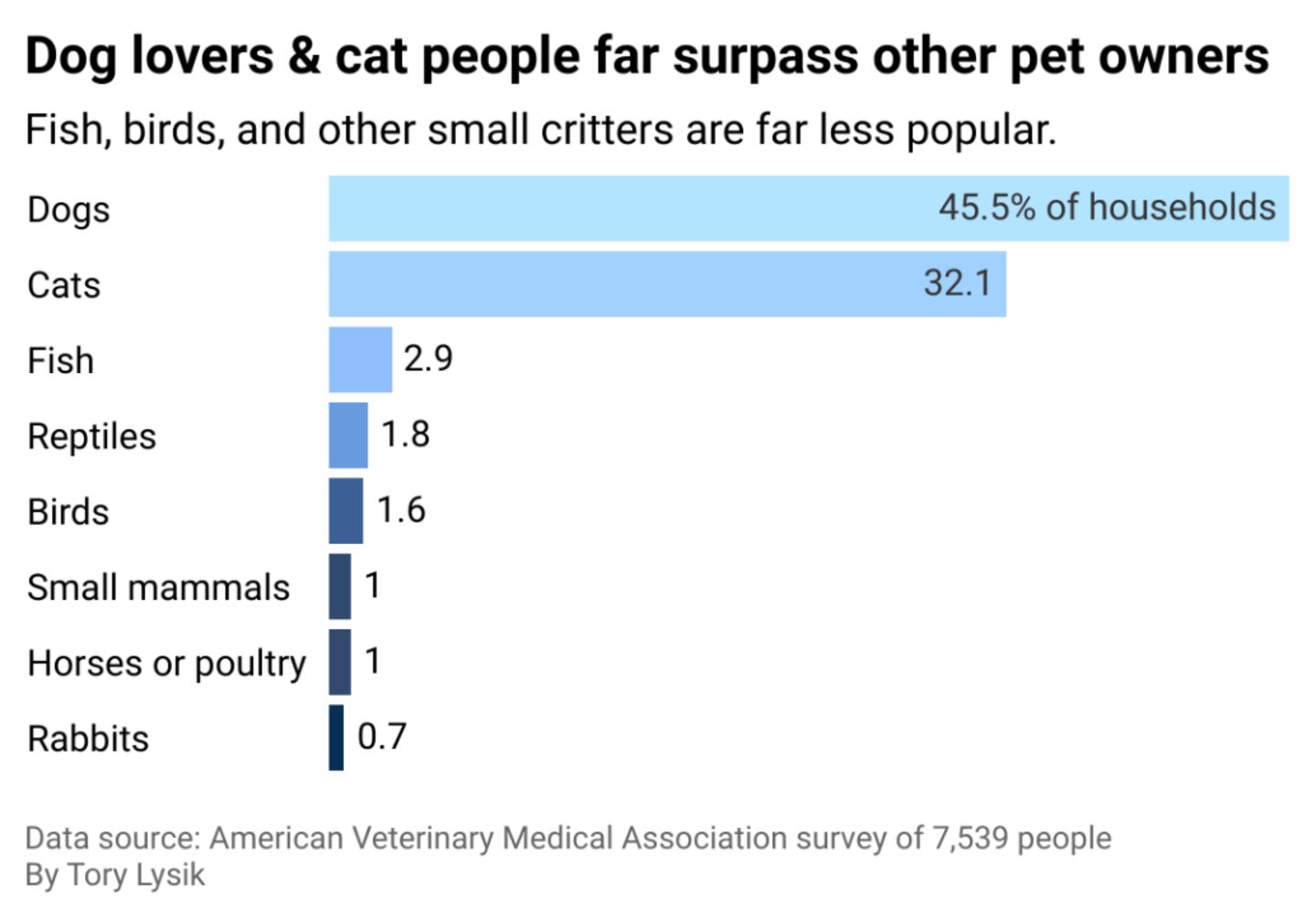 Canines are top dog when it comes to pet ownership: 45.5 million households have dogs compared to 32.1 million that have cats in 2024, according to the American Veterinary Medical Association. In a distant third are freshwater fish at 3.9 million, while birds, reptiles, and small animals trailing at 2.1 million, 2.3 million, and 1.3 million, respectively. To further explore why Americans prefer dogs to cats, Ollie used data from the AMVA to explore how pet popularity has shifted over the past three decades.