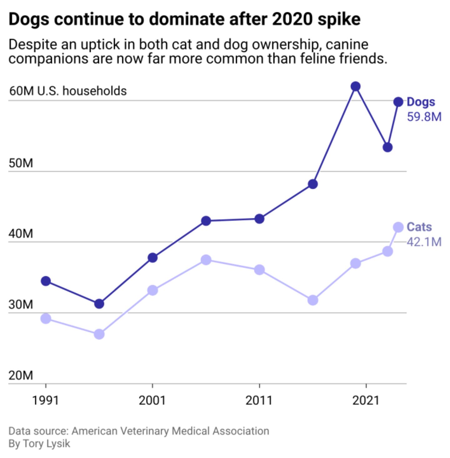 The COVID-19 pandemic and the ensuing shift to remote work drove much of this growth, with 1 in 5 American households adopting a new cat or dog between March 2020 and May 2021, according to the American Society for the Prevention of Cruelty to Animals. While these numbers have since dropped from the 2020 high, pet ownership remains significantly higher than at any other time since the 1990s.