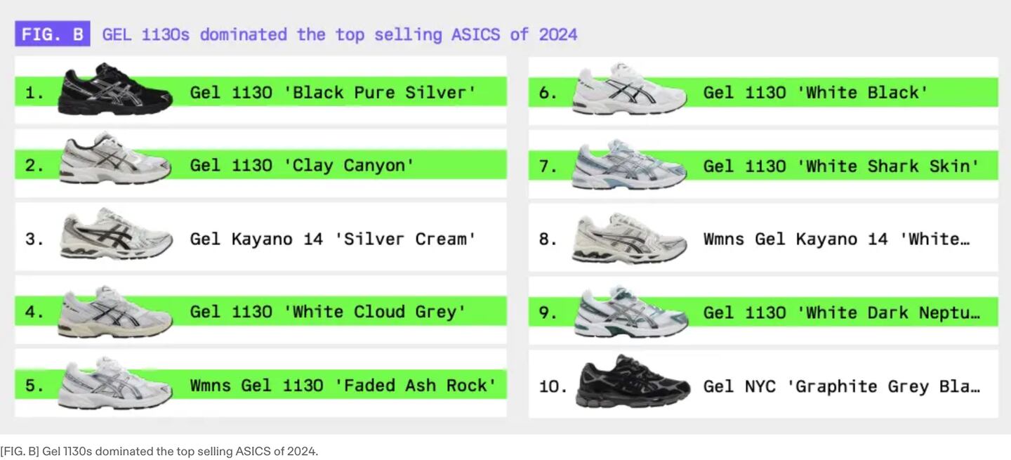GOAT reports on how the Gel 1130 sneaker is driving the majority of ASICS' business, accounting for 57% of sales and commanding a +44% average profit margin. (GOAT/GOAT)