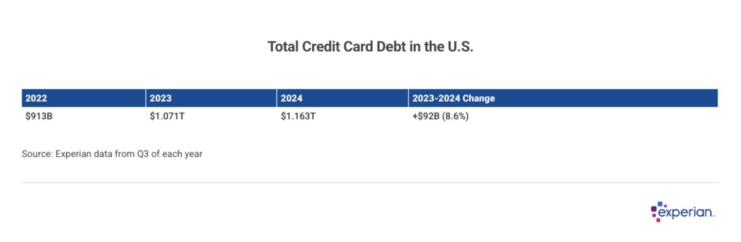 Despite record-high annual percentage rates (APRs) for consumers, credit card debt grew at a slower rate in 2024 than it did in 2023. The total amount of consumer credit card debt in the U.S. grew 8.6% to reach $1.16 trillion as of the third quarter (Q3) of 2024, according to Experian data.