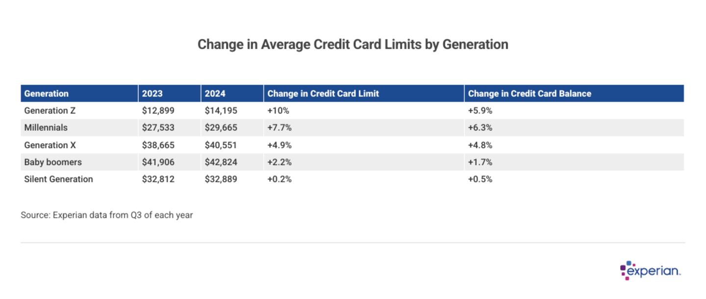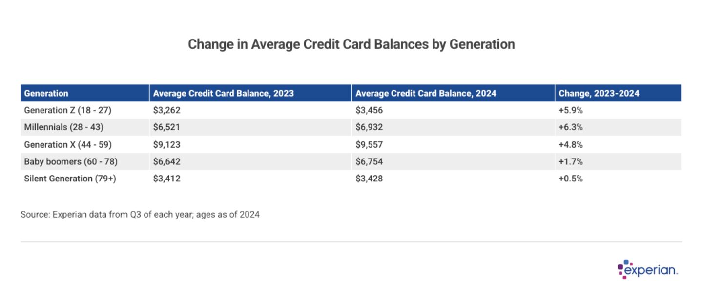 For the second consecutive year, millennial credit card balances grew faster than any other generation, according to Experian data. The 6.3% jump to $6,932 among millennials last year built on a double-digit percentage leap in 2023. This is also the second year in a row the millennial generation's average card balance was higher than the overall U.S. average. Based on historical debt trends, millennials' average balances will likely remain above the overall national average for years to come.