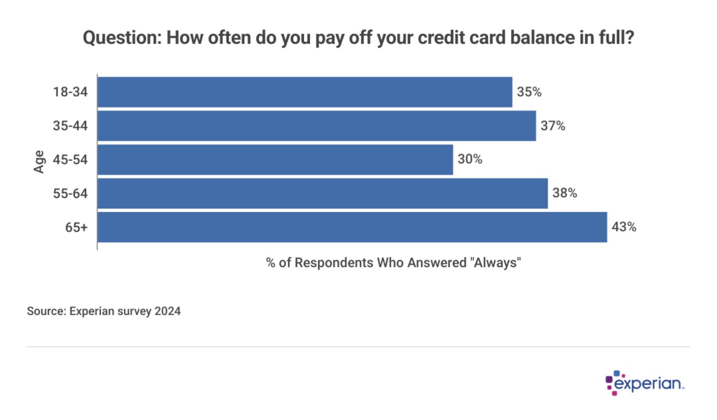 Additional evidence that Generation X has a bigger lift than other generations: They aren't as likely to be consistently paying their entire credit card balance each month, compared with other age ranges, according to an Experian survey conducted in 2024.
