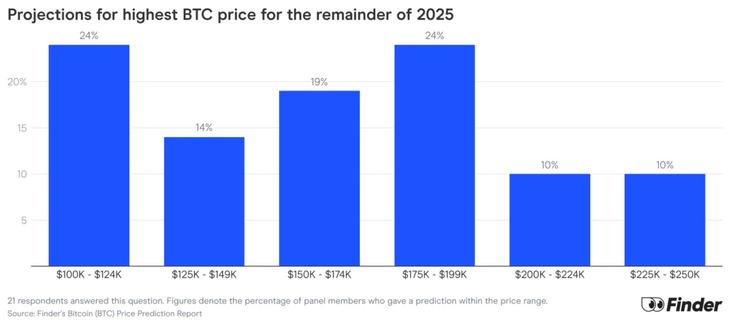 Bitcoin’s price is expected to rise to $145,167 by year-end 2025, according to the average prediction from Finder’s panelists.