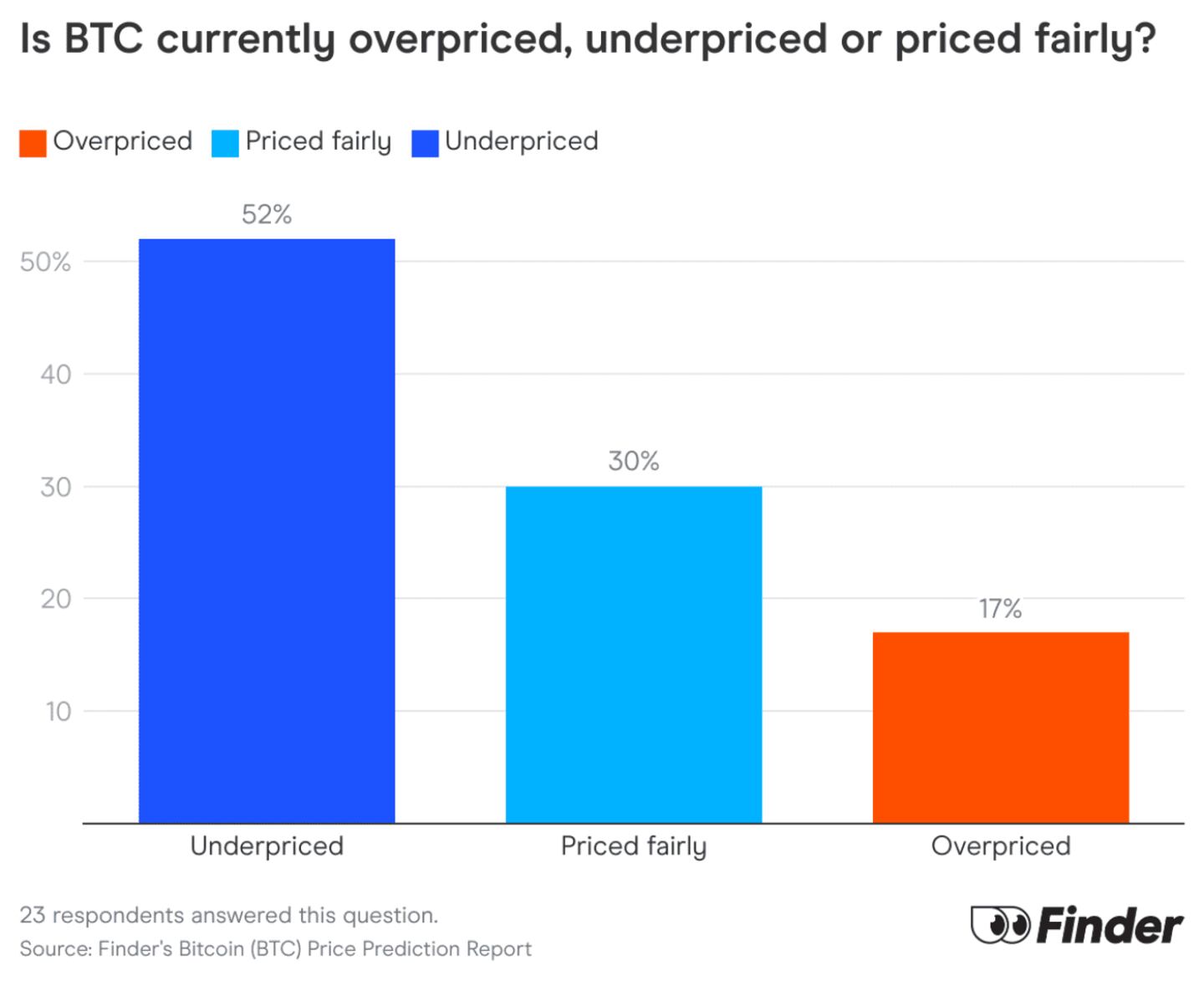 The remaining cohort is also split between 30% saying BTC is priced fairly and 17% saying it’s overpriced.