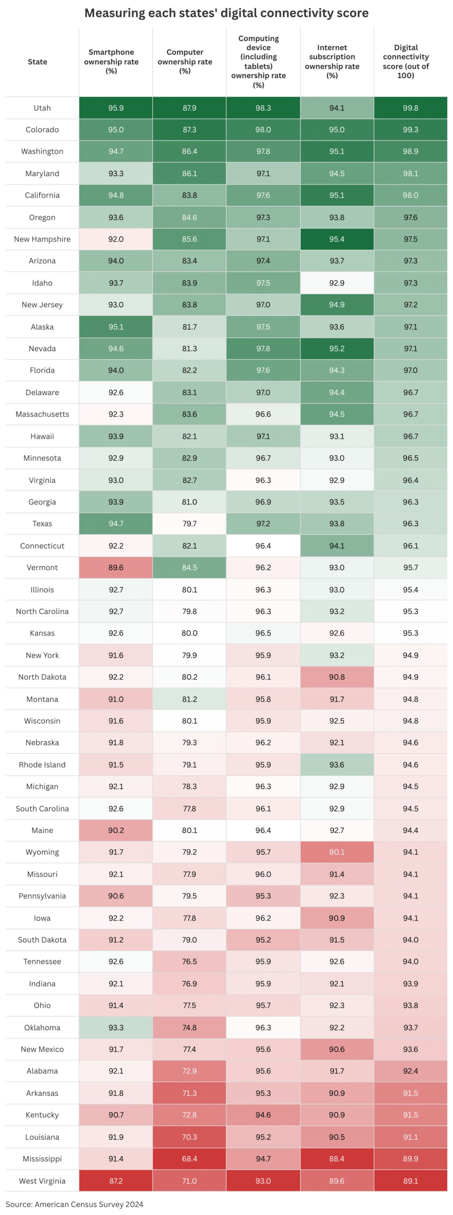 The leaders in digital connectivity: State rankings chart
