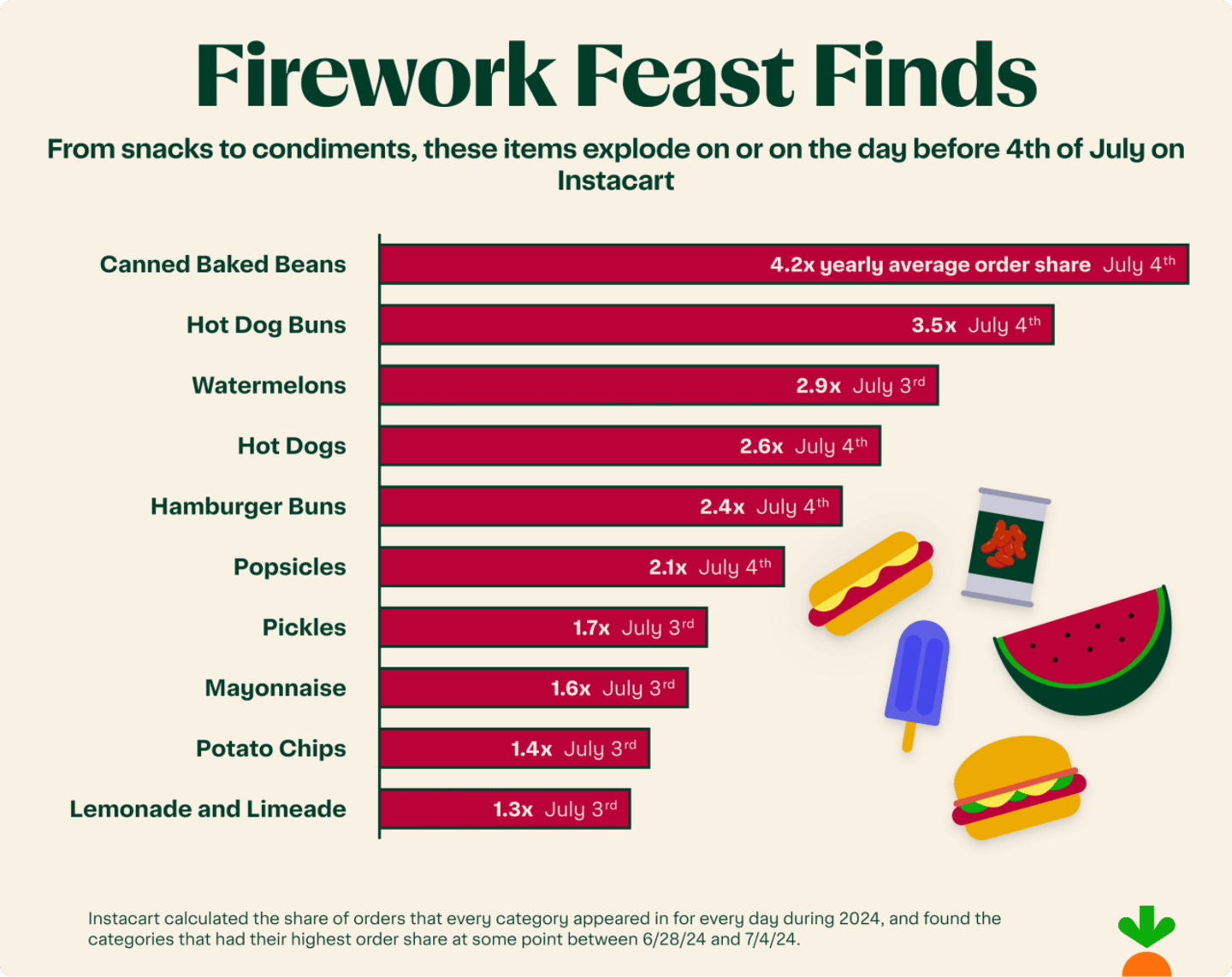When it comes to prepping for the big day, Americans go all-out on cookout classics. Topping the list of items that surged in share of orders is the essential barbecue side dish: canned baked beans, which saw 4.2 times more orders than the yearly average. Following closely behind are hot dog buns, watermelons, hamburger buns, and hot dogs, all showing massive spikes in popularity.