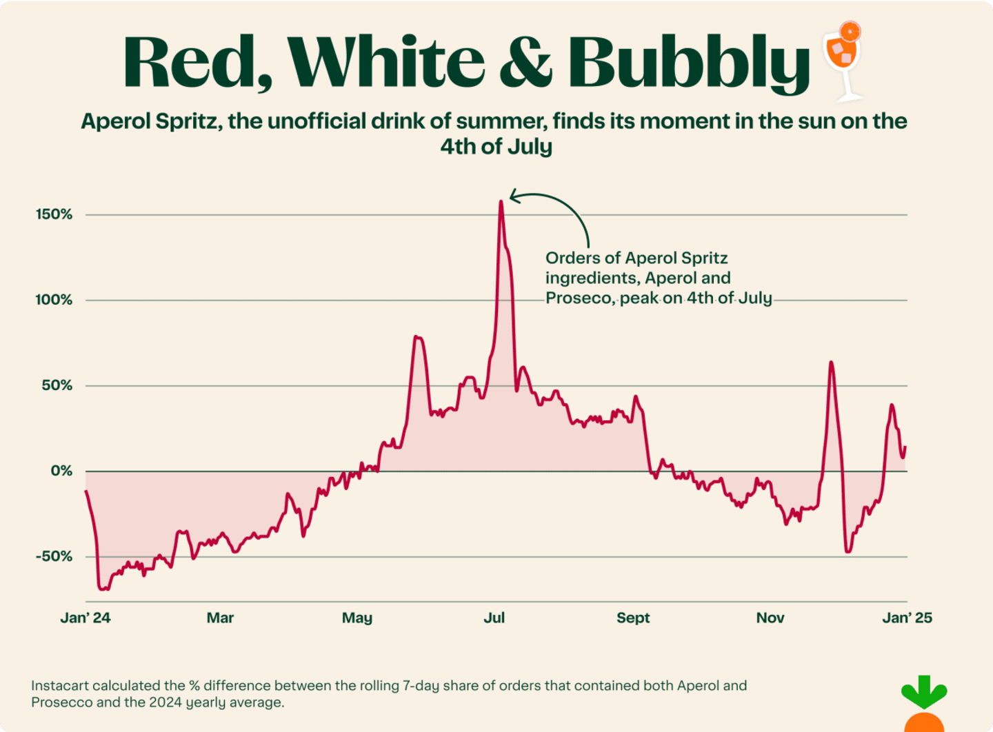 Trend alert: According to Instacart data, summer spritzes are gaining a lot of momentum, with the share of orders containing prosecco and Aperol rising 13% from 2023 to 2024.