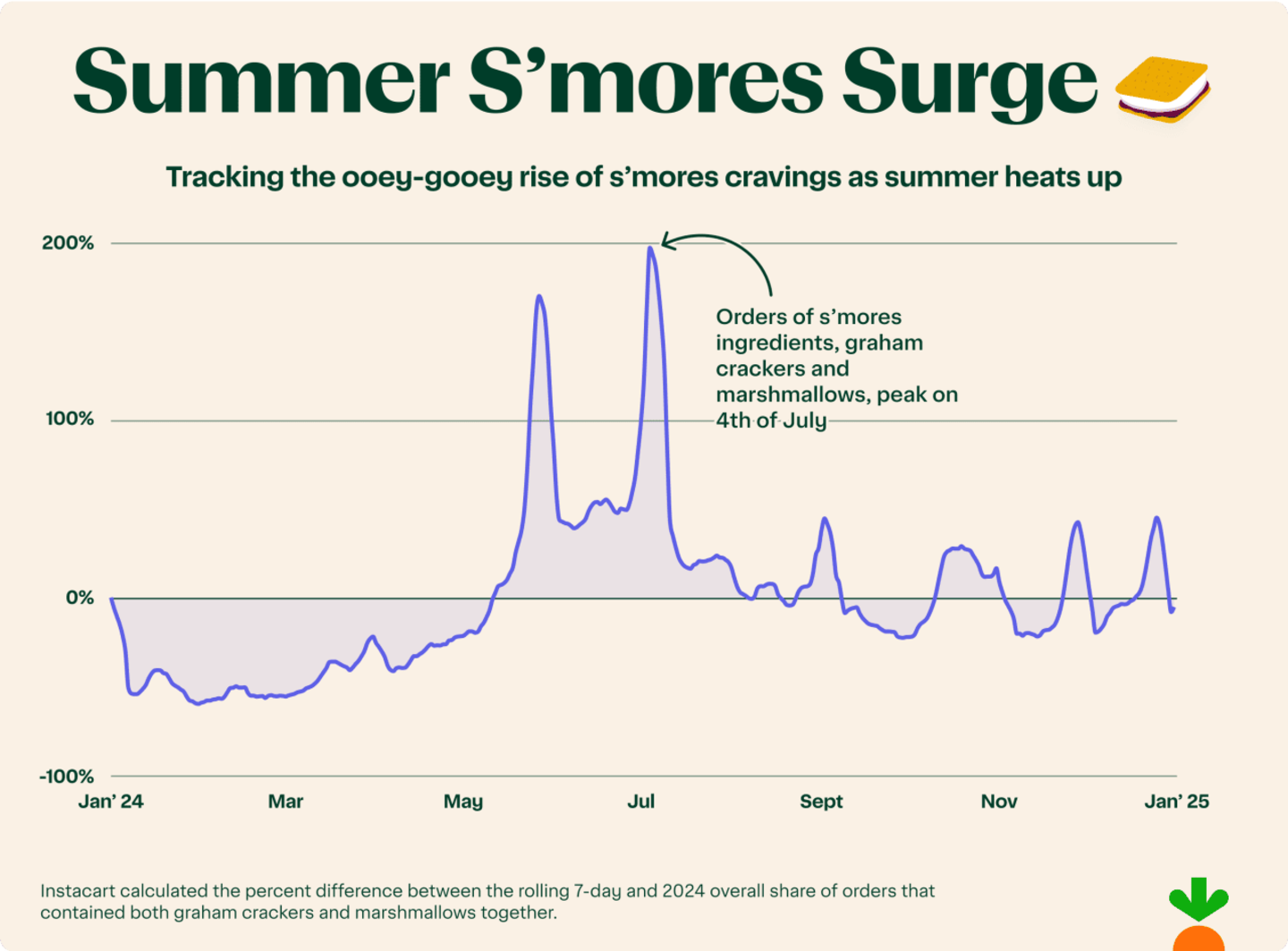 It wouldn’t be a summer celebration without s’mores. Orders containing both graham crackers and marshmallows surged nearly 200% above the yearly average during the week ending on July 4. It’s safe to say that the combo of campfires and s’mores is a quintessential summer favorite.