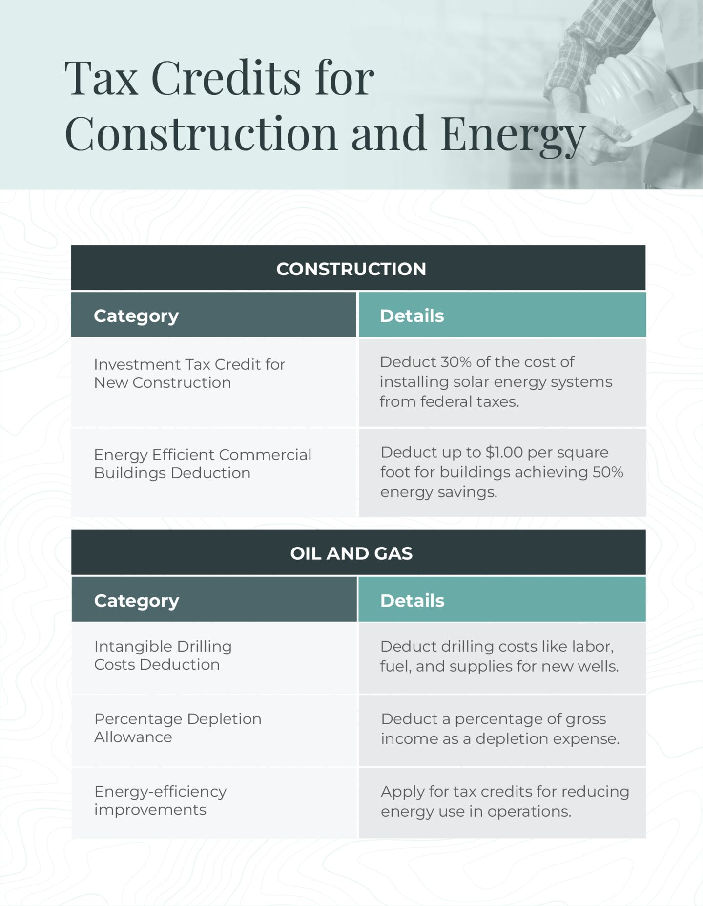 • Energy-efficiency improvements: Oil and gas companies that reduce energy use for operations can apply for energy efficiency tax credits.