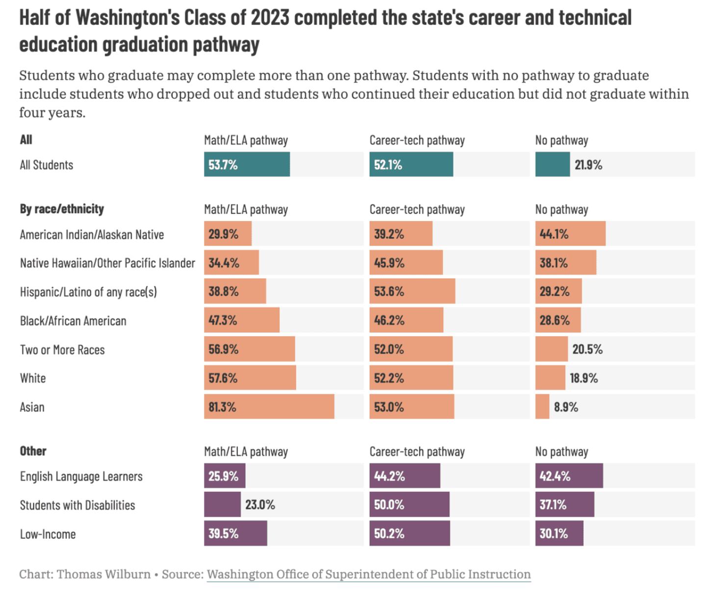 Asian and white students are much more likely to complete one of the math and English pathways, considered the college-prep route, while Native students, English learners, and students with disabilities are more likely to have no graduation pathway.