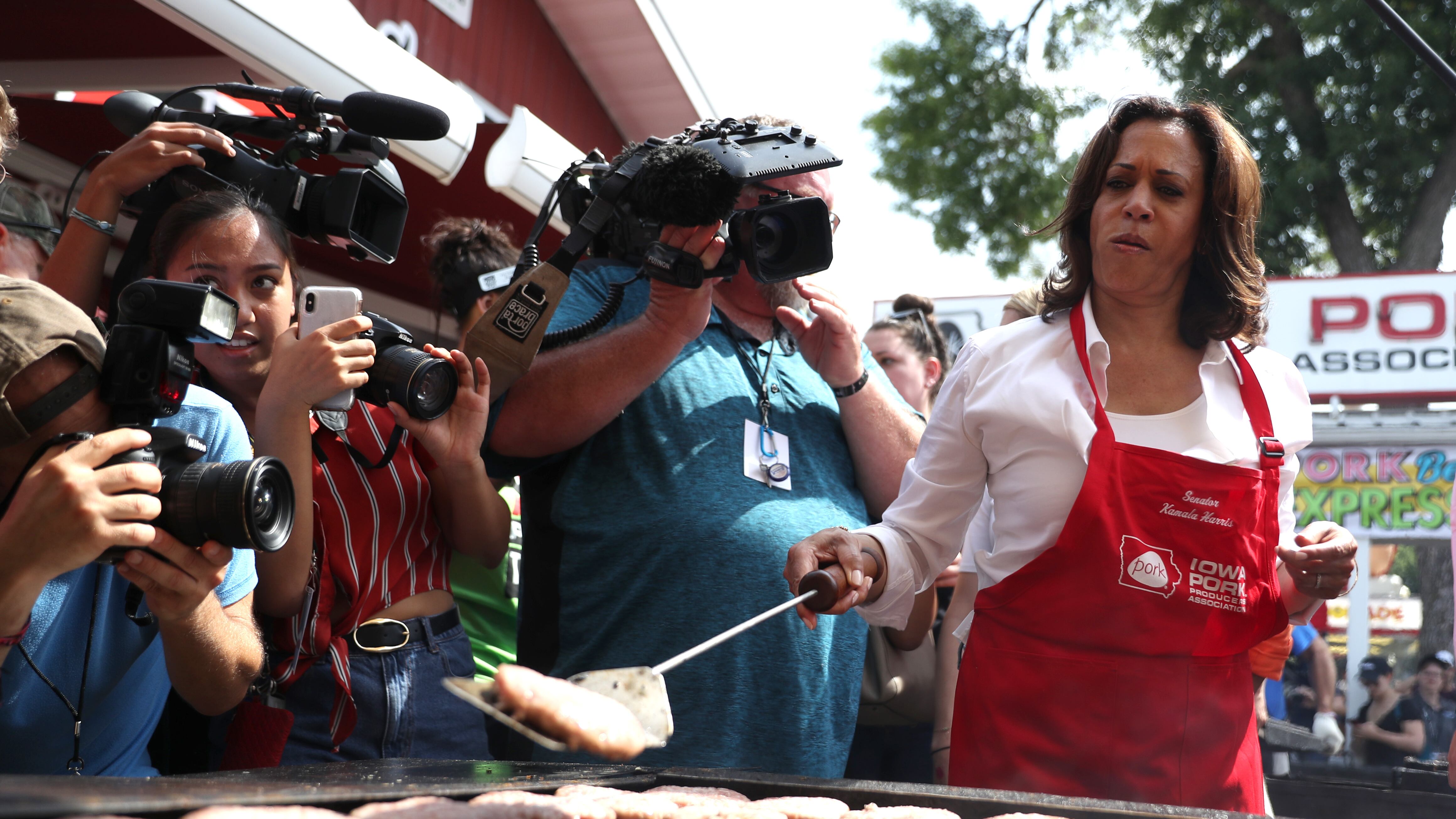 Presidential Candidate Kamala Harris Takes Campaign Bus Trip Across Iowa DES MOINES, IOWA - AUGUST 10: Democratic presidential candidate U.S. Sen. Kamala Harris (D-CA) cooks pork burgers at the Iowa Pork Producers tent while attending the Iowa State Fair on August 10, 2019 in Des Moines, Iowa. Kamala Harris is on a five day river-to-river bus tour across Iowa promoting her "3AM Agenda" to Iowans. (Photo by Justin Sullivan/Getty Images) (Justin Sullivan/Getty Images)