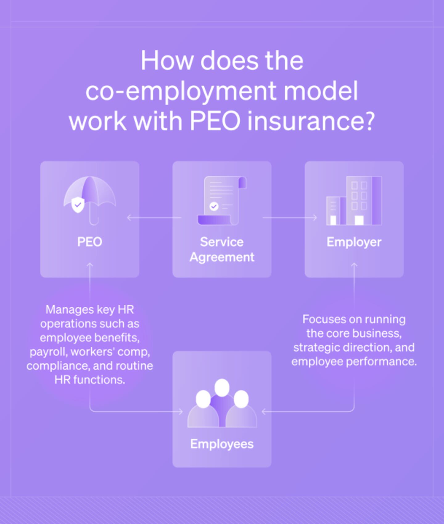 PEO insurance operates through a co-employment model in which the PEO and the business share employment responsibilities. The PEO handles HR tasks, including benefits management, while the business tackles daily operations.