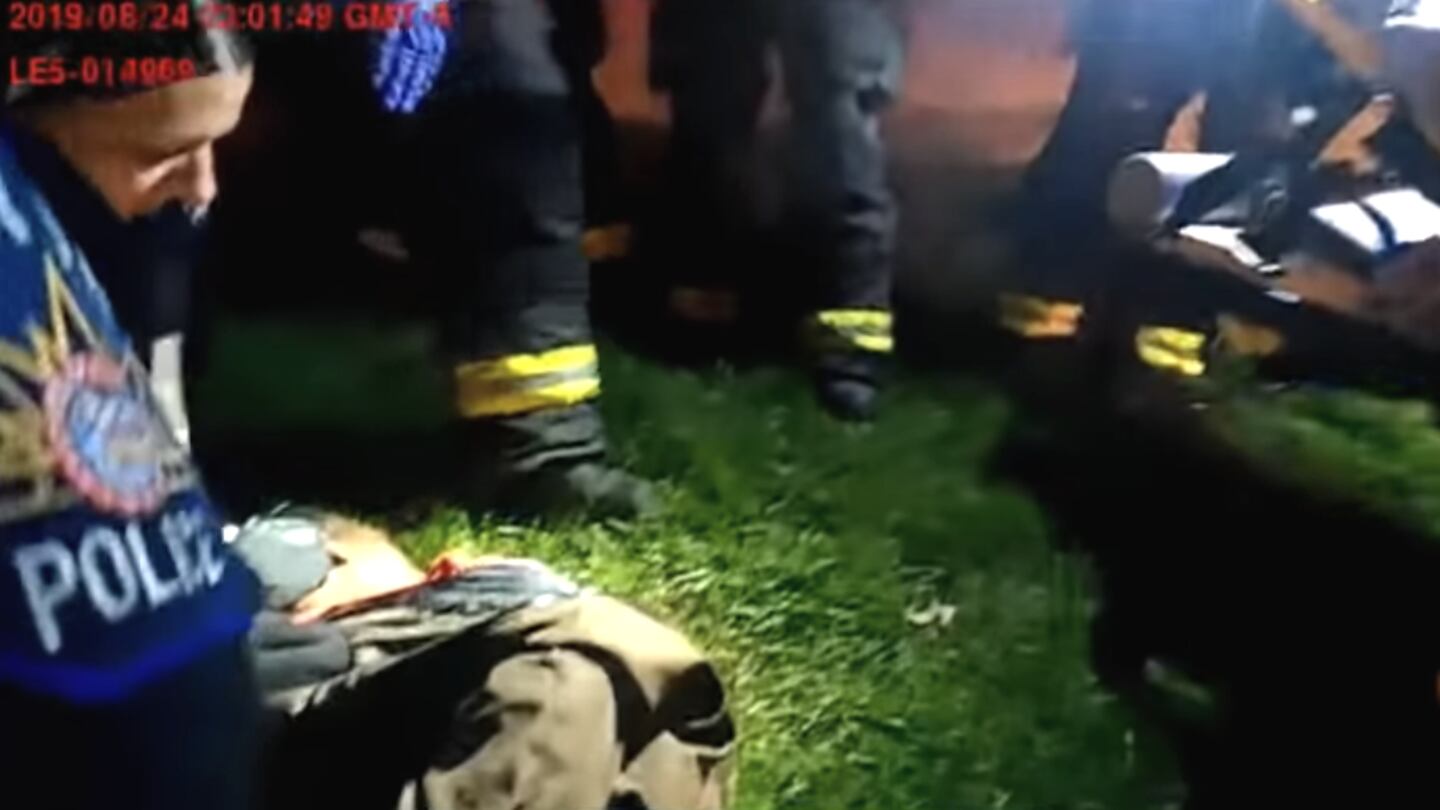 After he rolls over, an officer finds his earbuds in the grass where he had been laying. In the background, another officer can be heard giving someone else a phone update on what took place.