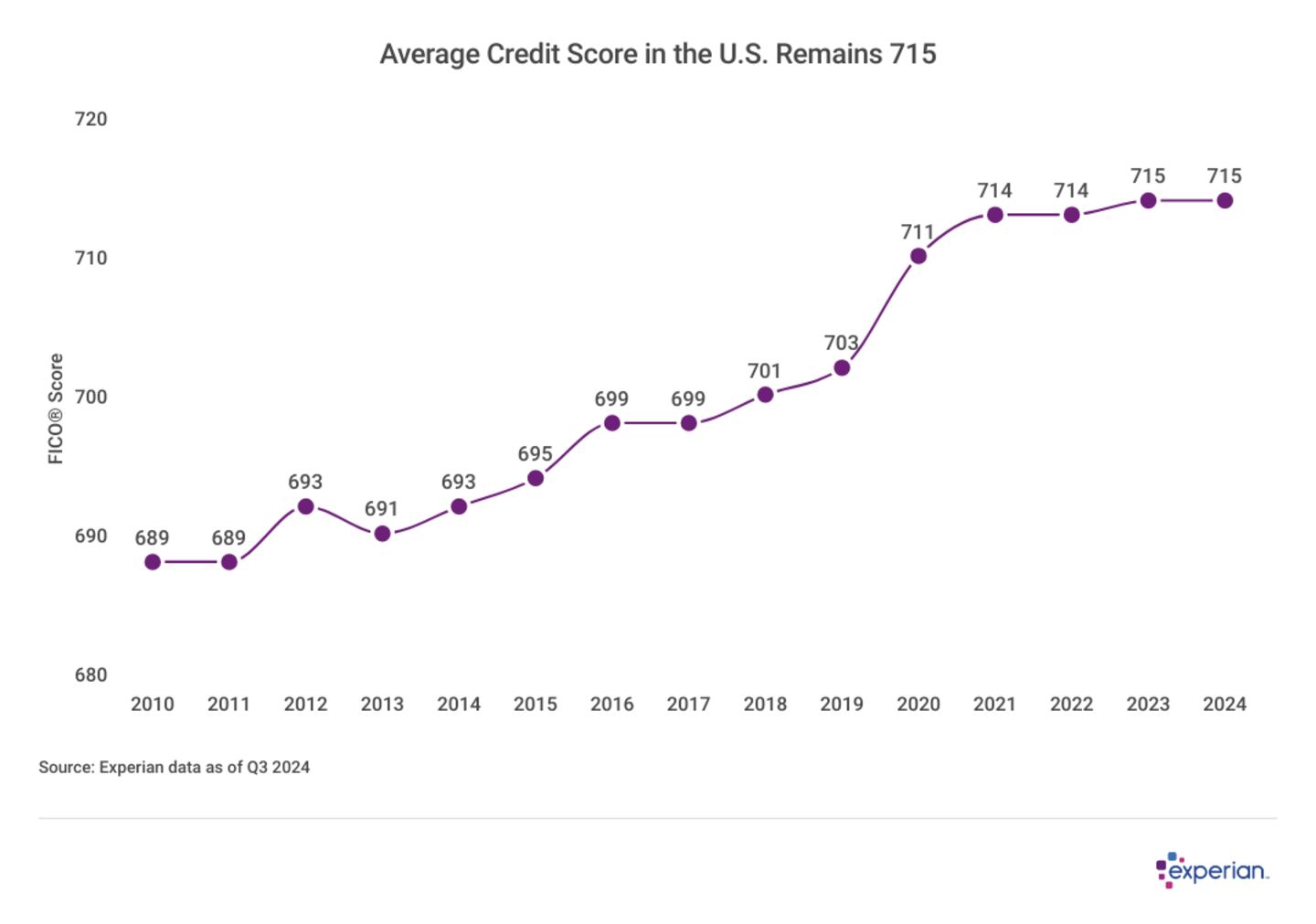 The average credit score was 715 in 2024, according to Experian data. That average, as of the third quarter of 2024, is unchanged from the same quarter in 2023. For 11 straight years, the average FICO® Score in the United States hasn't decreased on an annual basis. The resilience of the U.S. consumer evident here has arguably been assisted by increased awareness of financial matters, including the power of their credit score.
