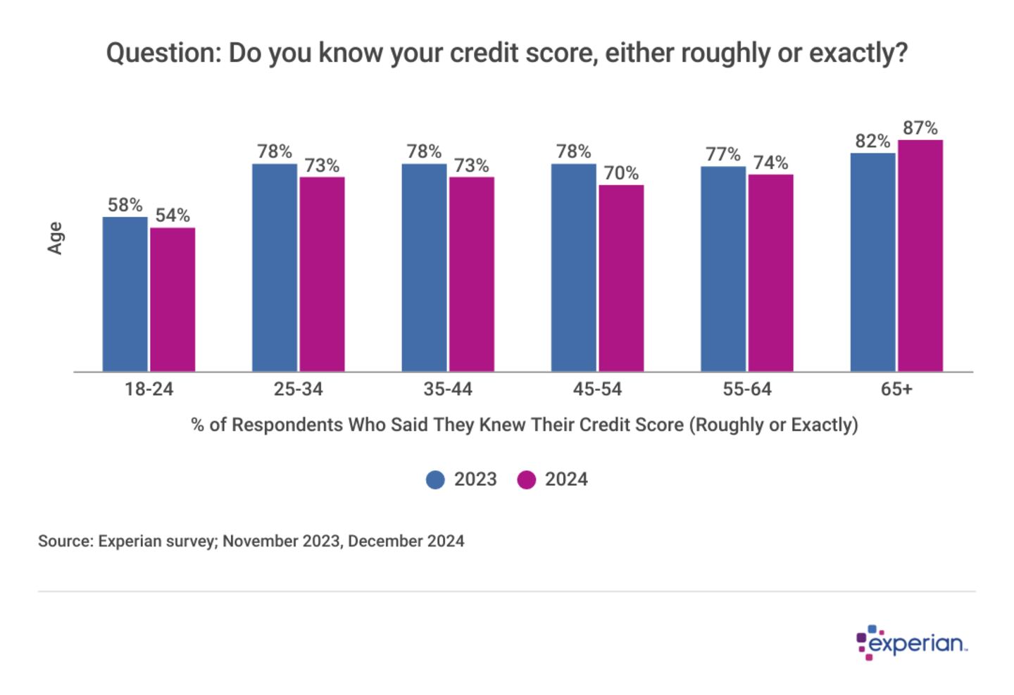 According to an Experian survey fielded in December 2024 of more than 1,000 consumers, slightly fewer consumers in 2024 could say they knew their credit score versus 2023. Overall, 72% of survey respondents said they had at least a rough idea of their credit score, down from 78% when we asked the same question in 2023.
