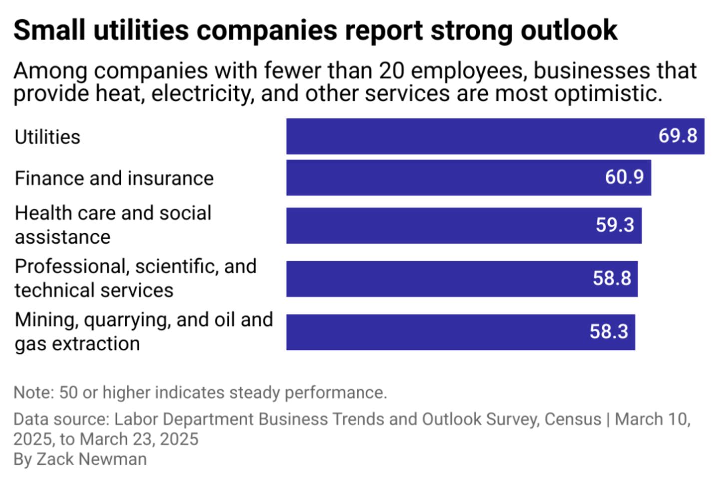 The utilities, mining, and finance sectors had the most optimistic outlook on future performance, according to Census data, with the fields reporting the highest levels of predicted demand. Mining and construction companies, in particular, reported they were more likely to hire more employees, a sign of potential growth.