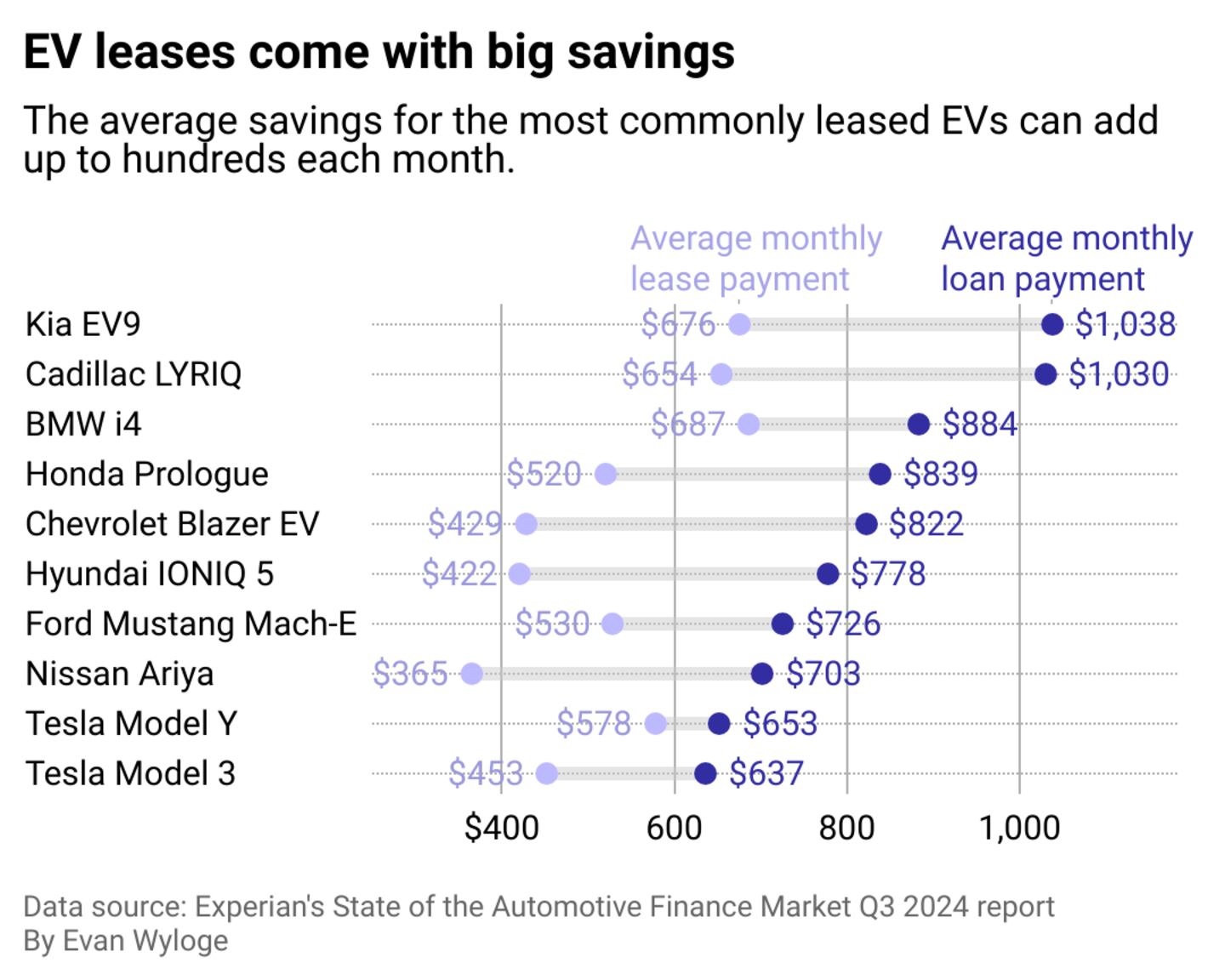 Among the most commonly leased EVs, such as the Kia EV9, Cadillac Lyriq, Hyundai Ioniq 5, and Nissan Ariya, an average monthly lease payment was over $300 less than an average monthly payment on a loan. The Chevrolet Blazer EV saw one of the biggest differences, with an average monthly lease of only $429. In contrast, an average monthly loan payment was nearly double that, at $822, for an average monthly savings of $393. Meanwhile, the Tesla Model Y saw a much smaller difference, with an average savings of $75 per month.