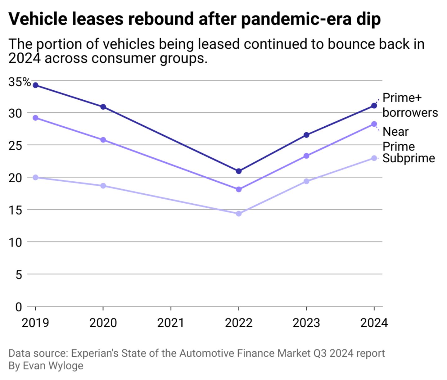 Finance rates for new and used vehicles increased, and the prevalence of leasing rose from prime to subprime borrowers, indicating an increased popularity of leasing among the buying public. Prime borrowers have good credit and are considered the least likely to default on loans; in contrast, subprime borrowers have a higher risk of nonpayment due to limited or damaged credit histories.